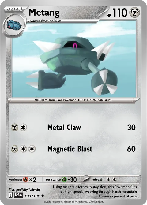 NO. 0375 Iron Claw Pokémon HT: 3' 11" WT: 446.4 lbs.illus. prettyflyfluttershy#133/181Using magnetic forces to stay aloft, this Pokémon flies at high speeds, weaving through harsh mountain terrain in pursuit of prey.Created by @Sickle_Dragon on 21 March 2026Includes assets by Creatures Inc.