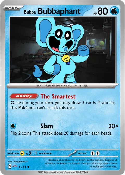 NO. 1 Plush Pokémon HT: 3'07" WT: 5.1 lbs.illus. Simomat2011#1/11Bubba Bubbaphant is the brains of the critters. Bright and attentive, he keeps his friends steady and always steers them to make smart choices.Created by @Simomat2011 on 02 March 2024