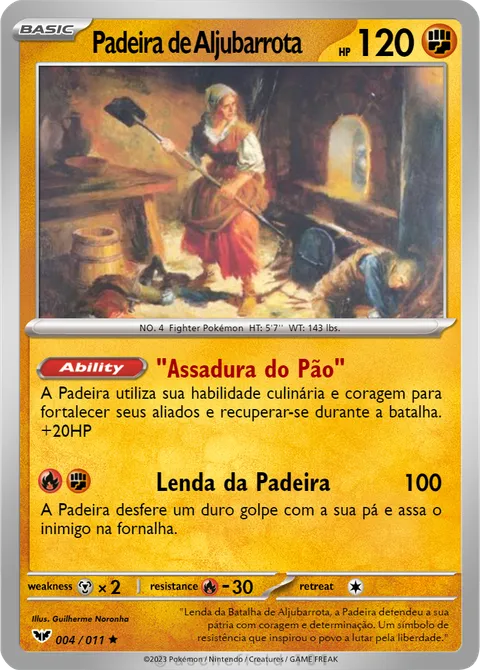 NO. 4 Fighter Pokémon HT: 5'7'' WT: 143 lbs.illus. Guilherme Noronha#004/011"Lenda da Batalha de Aljubarrota, a Padeira defendeu a sua pátria com coragem e determinação. Um símbolo de resistência que inspirou o povo a lutar pela liberdade."Created by @Sir_N0R0NHA on 26 September 2024Includes assets by Creatures Inc.