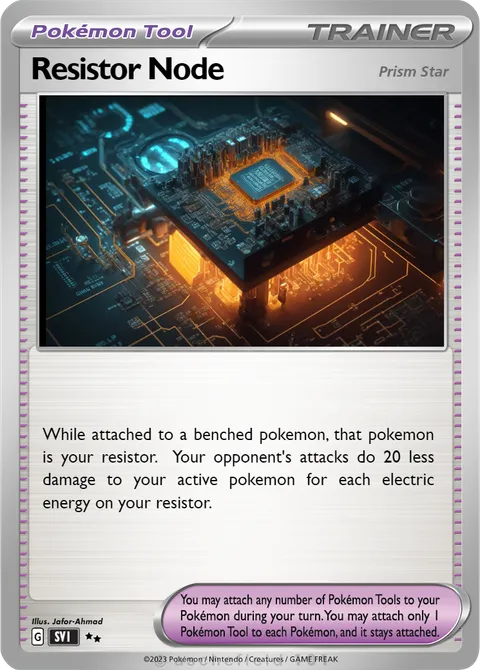 While attached to a benched pokemon, that pokemon is your resistor. Your opponent's attacks do 20 less damage to your active pokemon for each electric energy on your resistor.