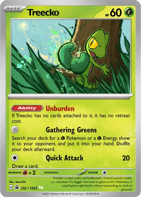 illus. SolusTCG#252/1025Treecko is cool, calm, and collected—it never panics under any situation. If a bigger foe were to glare at this Pokémon, it would glare right back without conceding an inch of ground.Created by @SolusTCG on 13 January 2025