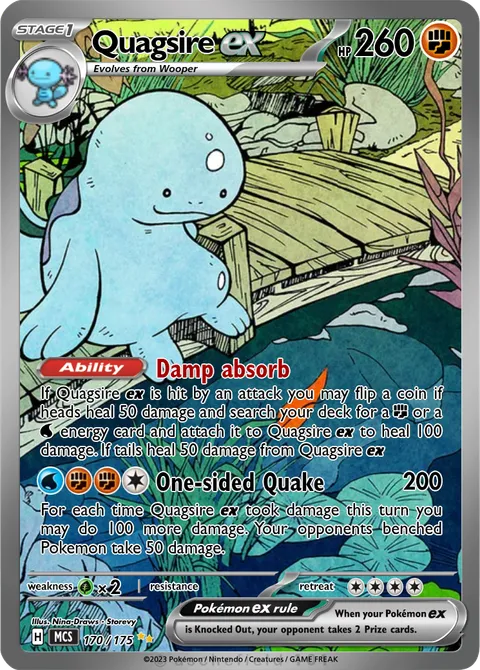 If Quagsire e is hit by an attack you may flip a coin if heads heal 50 damage and search your deck for a F or a W energy card and attach it to Quagsire e to heal 100 damage. If tails heal 50 damage from Quagsire eOne-sided Quake • 200+
