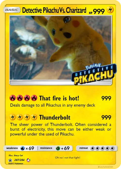 Deals damage to all Pikachus in any enemy deck The sheer power of Thunderbolt. Often considered a burst of electricity, this move can be either weak or powerful under the used of Pikachu. illus. Stacy Cat#287/284Oh no! not that fight!