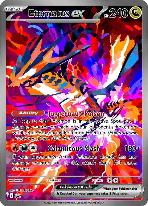 As long as this Pokémon is in the Active Spot, put 1 damage counter on each of your opponent's Pokémon with a Rule Box during Pokémon Checkup. (Pokémon e, Pokémon V, etc. have Rule Boxes.)Calamitous Slash • 180+