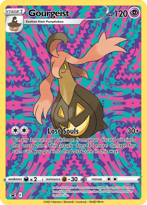 In the darkness of a new-moon night, Gourgeist will come knocking. Whoever answers the door will be swept off to the afterlife.Created by @StallDecksRule on 13 July 2024