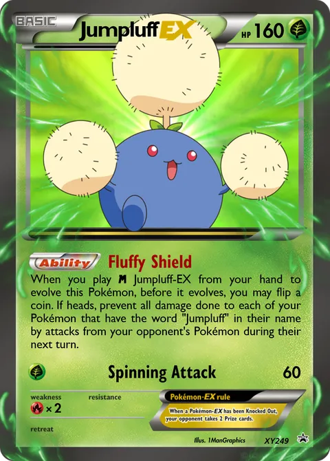 When you play m Jumpluff-EX from your hand to evolve this Pokémon, before it evolves, you may flip a coin. If heads, prevent all damage done to each of your Pokémon that have the word "Jumpluff" in their name by attacks from your opponent's Pokémon during their next turn.Spinning Attack • 60