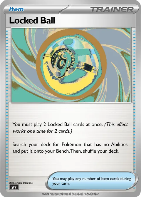 You must play 2 Locked Ball cards at once. (This effect works one time for 2 cards.) Search your deck for Pokémon that has no Abilities and put it onto your Bench. Then, shuffle your deck.
