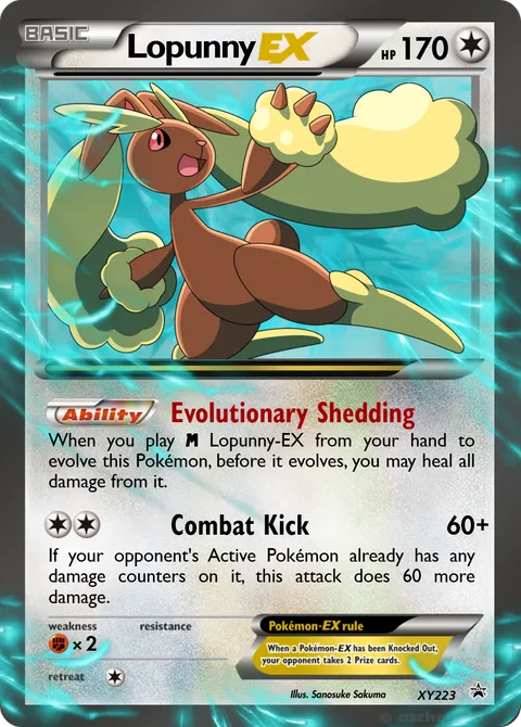 When you play m Lopunny-EX from your hand to evolve this Pokémon, before it evolves, you may heal all damage from it.Combat Kick • 60+