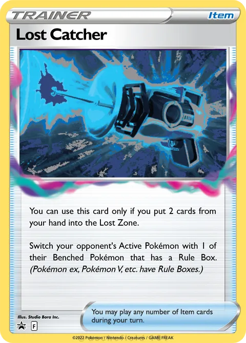 You can use this card only if you put 2 cards from your hand into the Lost Zone. Switch your opponent's Active Pokémon with 1 of their Benched Pokémon that has a Rule Box. (Pokémon ex, Pokémon V, etc. have Rule Boxes.)