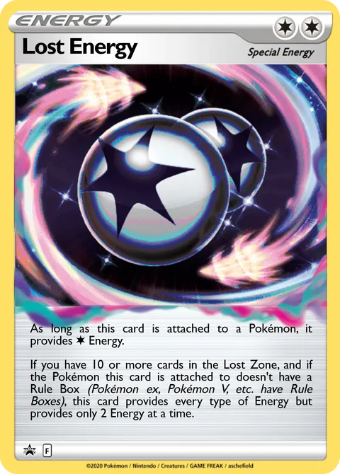 As long as this card is attached to a Pokémon, it provides C Energy. If you have 10 or more cards in the Lost Zone, and if the Pokémon this card is attached to doesn't have a Rule Box (Pokémon ex, Pokémon V, etc. have Rule Boxes), this card provides every type of Energy but provides only 2 Energy at a time.