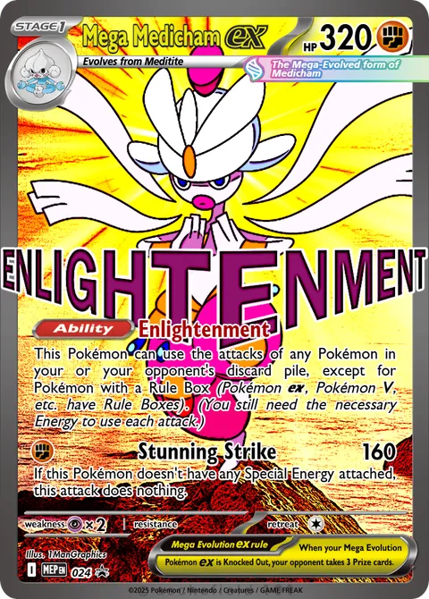 This Pokémon can use the attacks of any Pokémon in your or your opponent's discard pile, except for Pokémon with a Rule Box (Pokémon e, Pokémon V, etc. have Rule Boxes). (You still need the necessary Energy to use each attack.)Stunning Strike • 160