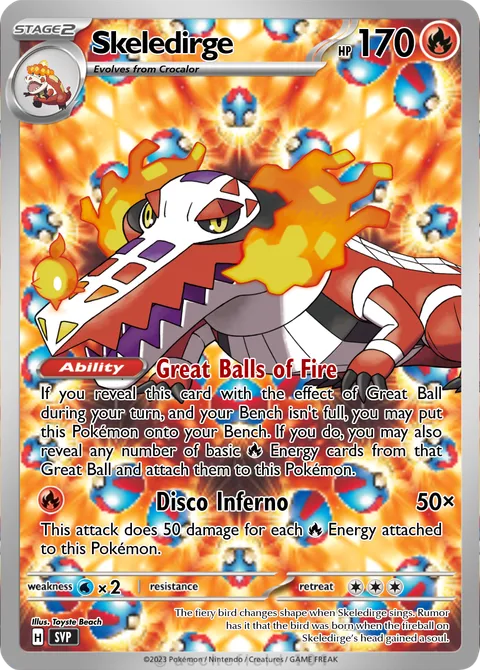 If you reveal this card with the effect of Great Ball during your turn, and your Bench isn't full, you may put this Pokémon onto your Bench. If you do, you may also reveal any number of basic R Energy cards from that Great Ball and attach them to this Pokémon.Disco Inferno • 50×