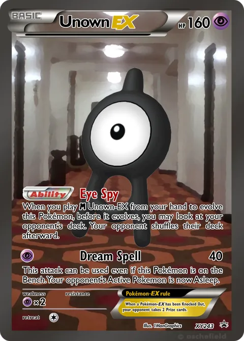 When you play m Unown-EX from your hand to evolve this Pokémon, before it evolves, you may look at your opponent's deck. Your opponent shuffles their deck afterward.Dream Spell • 40
