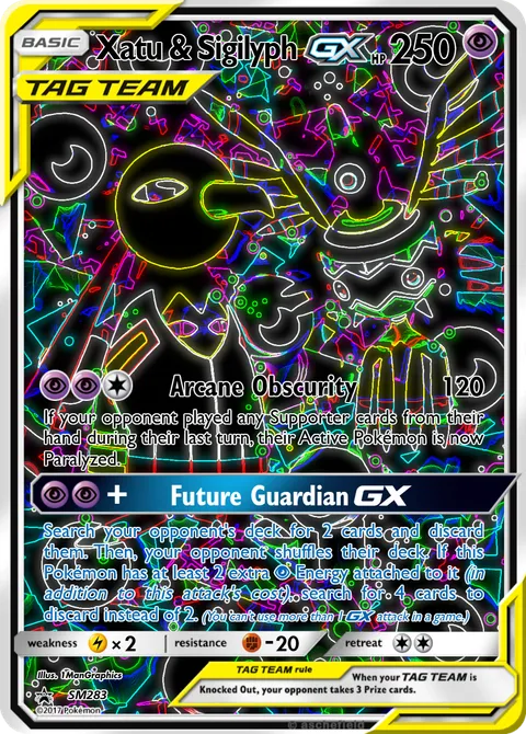 Search your opponent's deck for 2 cards and discard them. Then, your opponent shuffles their deck. If this Pokémon has at least 2 extra P Energy attached to it (in addition to this attack's cost), search for 4 cards to discard instead of 2.