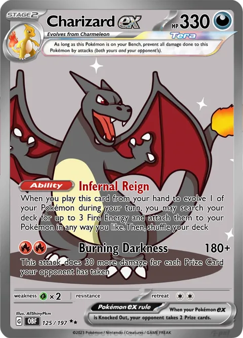When you play this card from your hand to evolve 1 of your Pokémon during your turn, you may search your deck for up to 3 Fire Energy and attach them to your Pokémon in any way you like. Then, shuffle your deckBurning Darkness • 180+