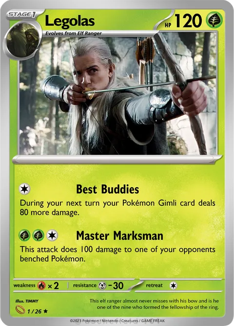 illus. TIMMY#1/26This elf ranger almost never misses with his bow and is he one of the nine who formed the fellowship of the ring.Created by @TIMMYDAPOKEGUY on 05 May 2025