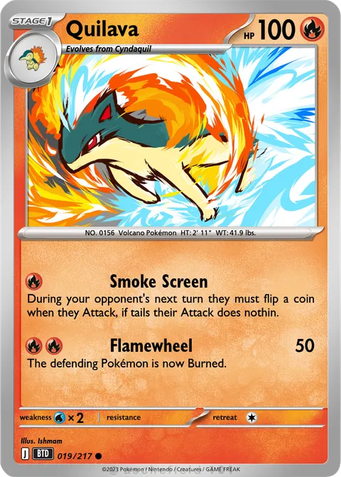 NO. 0156 Volcano Pokémon HT: 2' 11" WT: 41.9 lbs.illus. Ishmam#019/217Created by @T_Wheel on 01 March 2026, last edited on 01 March 2026Includes assets by Creatures Inc.