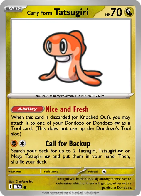 NO. 0978 Mimicry Pokémon HT: 1' 0" WT: 17.6 lbs.illus. Creatures IncTatsugiri will battle furiously among themselves to determine which of them will get to partner with a particular Dondozo.Created by @ThatGholdengoGuy1 on 14 January 2026, last edited on 14 January 2026Includes assets by Creatures Inc.