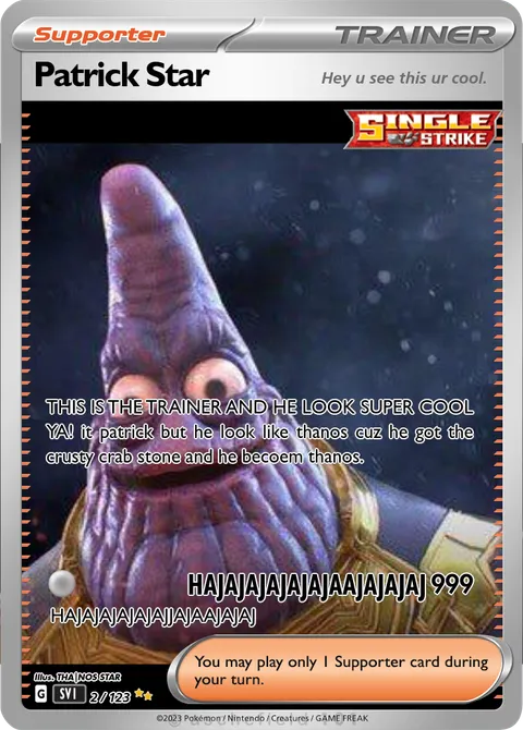 THIS IS THE TRAINER AND HE LOOK SUPER COOL YA! it patrick but he look like thanos cuz he got the crusty crab stone and he becoem thanos.