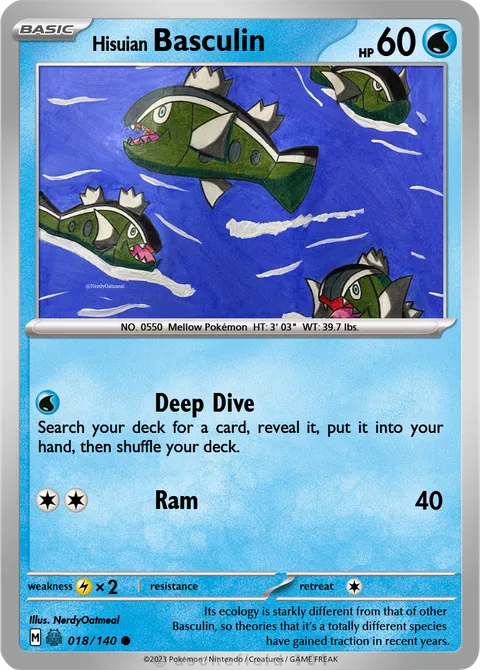 NO. 0550 Mellow Pokémon HT: 3' 03" WT: 39.7 lbs.illus. NerdyOatmeal#018/140Its ecology is starkly different from that of other Basculin, so theories that it’s a totally different species have gained traction in recent years.Created by @TheKnight on 22 December 2025