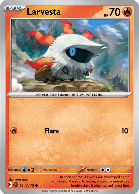NO. 0636 Torch Pokémon HT: 3' 07" WT: 63.7 lbs.illus. Kuroimori#014/140In ancient times, Larvesta was worshiped as the emissary of the sun. However, it was also viewed as a burden since it often caused forest fires.Created by @TheKnight on 22 December 2025