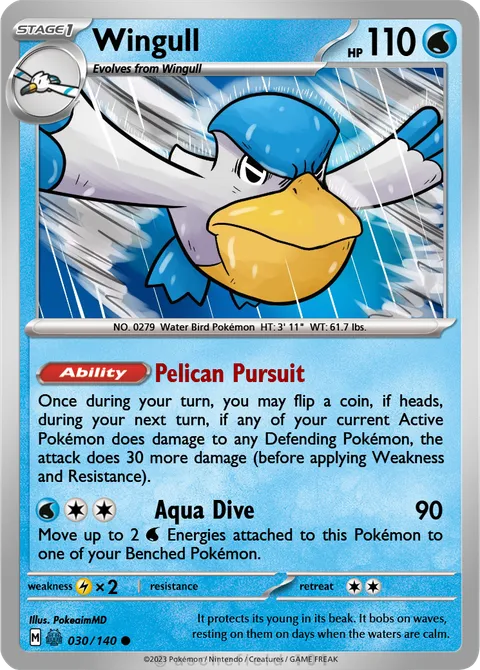 Once during your turn, you may flip a coin, if heads, during your next turn, if any of your current Active Pokémon does damage to any Defending Pokémon, the attack does 30 more damage (before applying Weakness and Resistance).Aqua Dive • 90