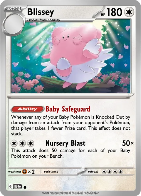 Whenever any of your Baby Pokémon is Knocked Out by damage from an attack from your opponent's Pokémon, that player takes 1 fewer Prize card. This effect does not stack.Nursery Blast • 50×
