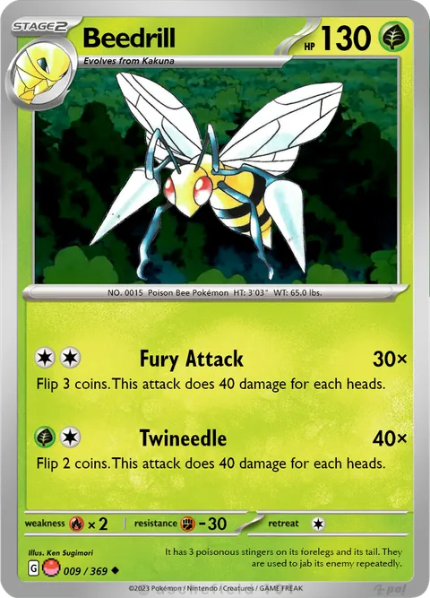 NO. 0015 Poison Bee Pokémon HT: 3'03" WT: 65.0 lbs.illus. Ken Sugimori#009/369 It has 3 poisonous stingers on its forelegs and its tail. They are used to jab its enemy repeatedly.Created by @ThickTomato on 06 February 2024