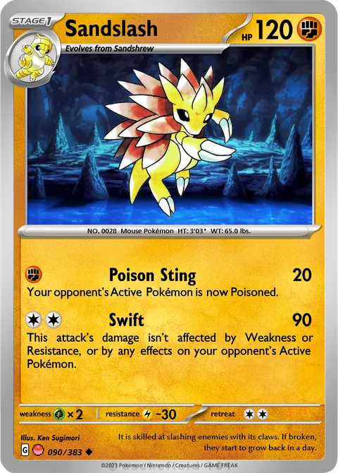 NO. 0028 Mouse Pokémon HT: 3'03" WT: 65.0 lbs.illus. Ken Sugimori#090/383It is skilled at slashing enemies with its claws. If broken, they start to grow back in a day.Created by @ThickTomato on 22 October 2024
