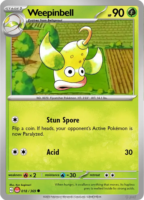 NO. 0070 Flycatcher Pokémon HT: 3'03" WT: 14.1 lbs.illus. Ken Sugimori#018/369 When hungry, it swallows anything that moves. Its hapless prey is melted inside by strong acids.Created by @ThickTomato on 06 February 2024