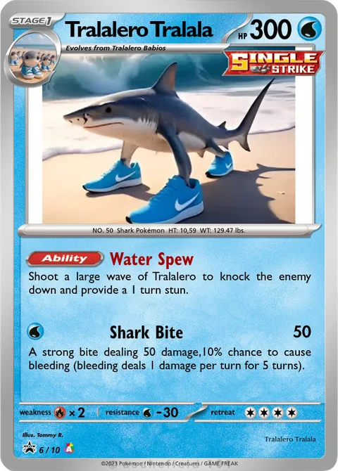 Shoot a large wave of Tralalero to knock the enemy down and provide a 1 turn stun.Shark Bite • 50