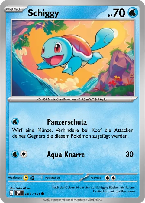 NO. 007 Minikröten Pokémon HT: 0.5 m WT: 9.0 kg lbs.illus. Isidor Glaser#007/151Nach der Geburt bildet sich auf Schiggys Rücken ein Panzer. Es attackiert mit Sprühschaum.Created by @Toto100 on 21 September 2024
