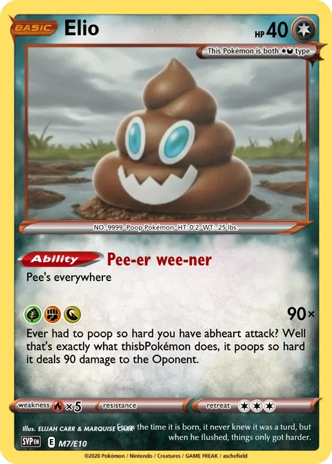 NO. 9999 Poop Pokémon HT: 0'2 WT: .25 lbs.illus. ELIJAH CARR & MARQUISE CARR#M7/E10From the time it is born, it never knew it was a turd, but when he flushed, things only got harder.Created by @Trooly_lie on 18 February 2026