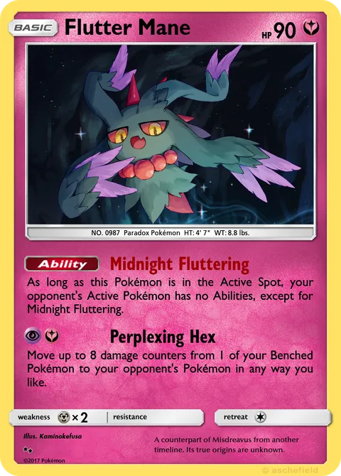 As long as this Pokémon is in the Active Spot, your opponent's Active Pokémon has no Abilities, except for Midnight Fluttering.Perplexing Hex