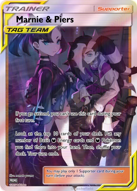 If you go second, you can’t use this card during your first turn. Look at the top 10 cards of your deck. Put any number of Basic D Energy cards and D Pokémon you find there into your hand. Then, shuffle your deck. Your turn ends.