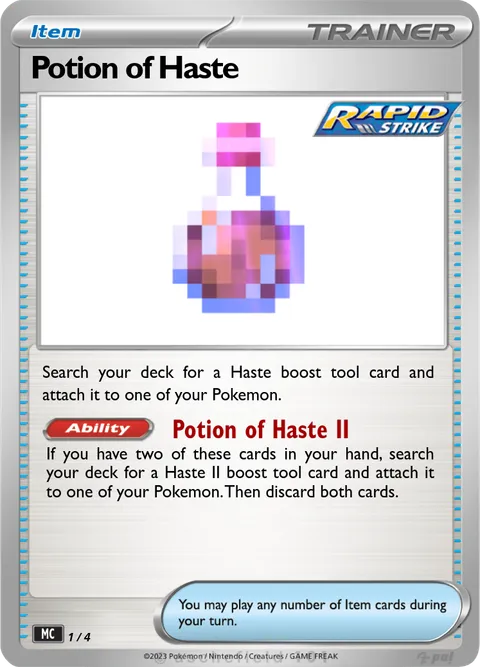 If you have two of these cards in your hand, search your deck for a Haste II boost tool card and attach it to one of your Pokemon. Then discard both cards.Created by @TrueLightMaster123 on 03 January 2024