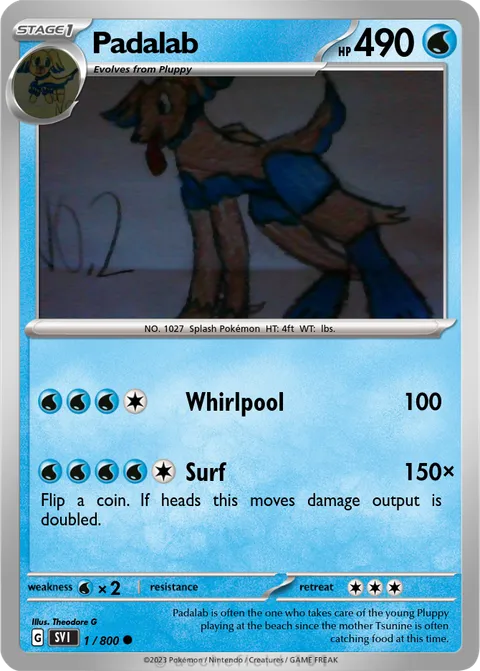 NO. 1027 Splash Pokémon HT: 4ft WT: lbs.illus. Theodore G#1/800Padalab is often the one who takes care of the young Pluppy playing at the beach since the mother Tsunine is often catching food at this time. Created by @UltraGamer on 24 March 2025