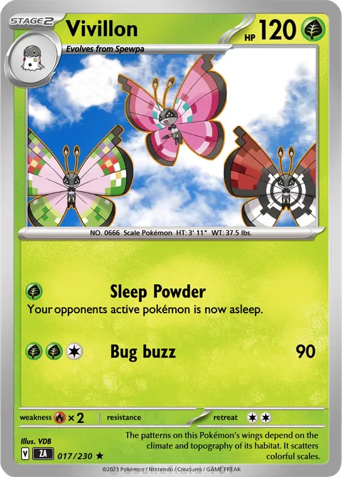 NO. 0666 Scale Pokémon HT: 3' 11" WT: 37.5 lbs.illus. VDB#017/230The patterns on this Pokémon’s wings depend on the climate and topography of its habitat. It scatters colorful scales.Created by @Viccieboyy on 08 March 2026Includes assets by Creatures Inc.