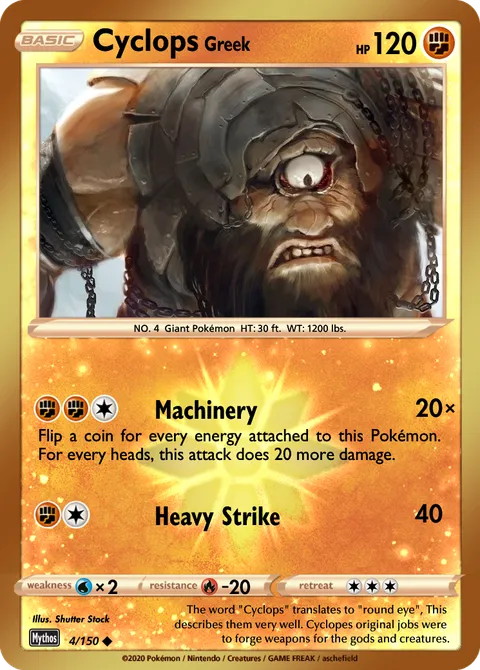 NO. 4 Giant Pokémon HT: 30 ft. WT: 1200 lbs.illus. Shutter Stock#4/150The word "Cyclops" translates to "round eye", This describes them very well. Cyclopes original jobs were to forge weapons for the gods and creatures.Created by @Voidd on 27 November 2025