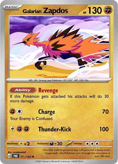 NO. 145 Strong Legs Pokémon HT: 5'03'' WT: 128.3 lbs.illus. LeviathanDoll#17/103One kick from its powerful legs will pulverize a dump truck. Supposedly, this Pokémon runs through the mountains at over 180 mph.Created by @Voindex on 06 September 2024