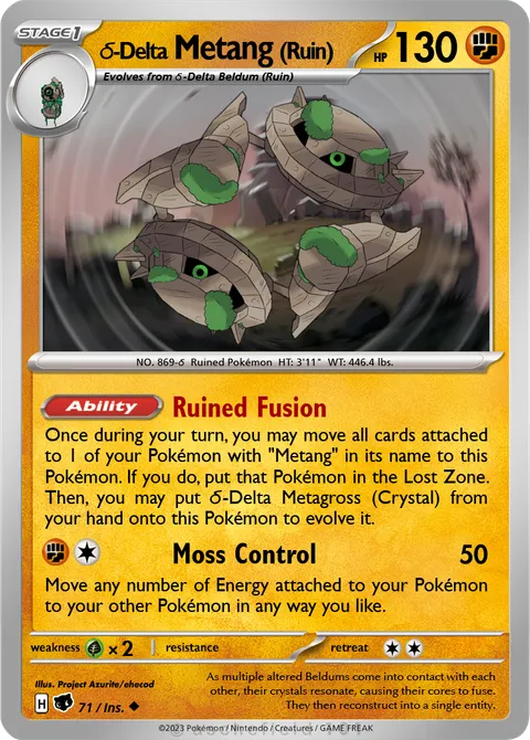 Once during your turn, you may move all cards attached to 1 of your Pokémon with "Metang" in its name to this Pokémon. If you do, put that Pokémon in the Lost Zone. Then, you may put d-Delta Metagross (Crystal) from your hand onto this Pokémon to evolve it.Moss Control • 50