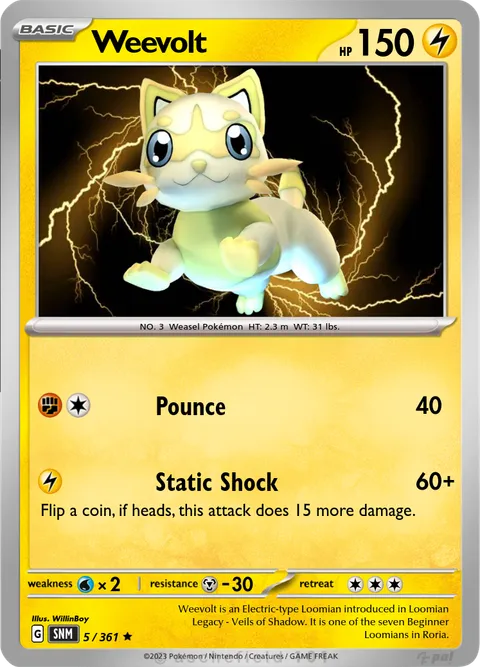 NO. 3 Weasel Pokémon HT: 2.3 m WT: 31 lbs.illus. WillinBoy#5/361Weevolt is an Electric-type Loomian introduced in Loomian Legacy - Veils of Shadow. It is one of the seven Beginner Loomians in Roria.Created by @WillinBoy on 23 November 2023