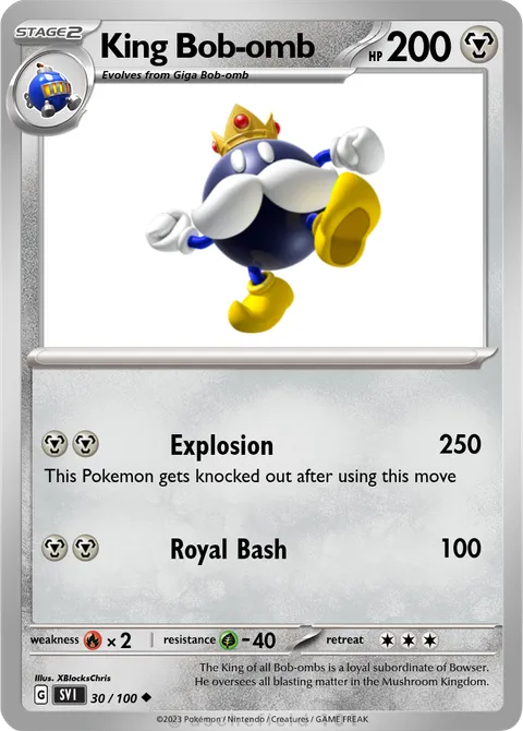 illus. XBlocksChris#30/100The King of all Bob-ombs is a loyal subordinate of Bowser. He oversees all blasting matter in the Mushroom Kingdom.Created by @XBlocksChris on 26 April 2025