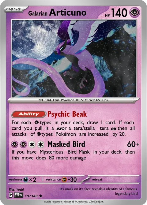 For each P types in your deck, draw 1 card. If each card you pull is a e or a tera/stella tera e, then all attacks of P types Pokémon are increased by 20.Masked Bird • 60+