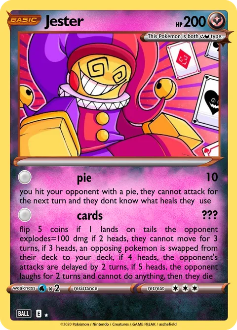 flip 5 coins if 1 lands on tails the opponent explodes=100 dmg if 2 heads, they cannot move for 3 turns, if 3 heads, an opposing pokemon is swapped from their deck to your deck, if 4 heads, the opponent's attacks are delayed by 2 turns, if 5 heads, the opponent laughs for 2 turns and cannot do anything, then they die