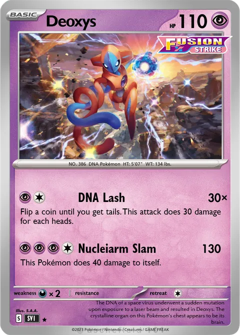 NO. 386 DNA Pokémon HT: 5'07" WT: 134 lbs.illus. S.A.A.The DNA of a space virus underwent a sudden mutation upon exposure to a laser beam and resulted in Deoxys. The crystalline organ on this Pokémon’s chest appears to be its brain.Created by @Yoshigamer8 on 13 April 2024