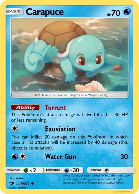 N°0005 Mini Turtle Pokémon Height : 0,5 m Weight : 9,1 kgillus. Yveltal#14/10000Most Carapuce often withdraw into their carapace at the slightest danger to spray water at high pressure. The more courageous evolve faster.Created by @Yveltal on 21 November 2023