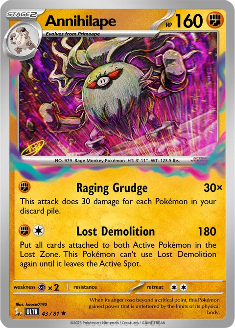 NO. 979 Rage Monkey Pokémon HT: 3' 11" WT: 123.5 lbs.illus. kaosu0195#43/81When its anger rose beyond a critical point, this Pokémon gained power that is unfettered by the limits of its physical body. Created by @ZbytSmol on 28 September 2025
