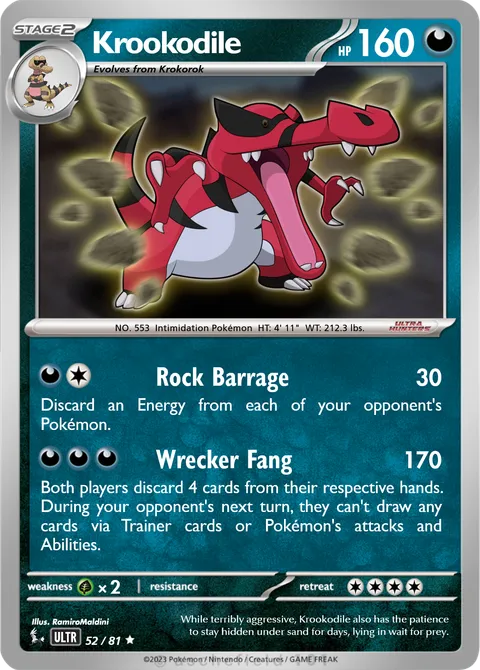NO. 553 Intimidation Pokémon HT: 4' 11" WT: 212.3 lbs.illus. RamiroMaldini#52/81 While terribly aggressive, Krookodile also has the patience to stay hidden under sand for days, lying in wait for prey. Created by @ZbytSmol on 03 October 2025