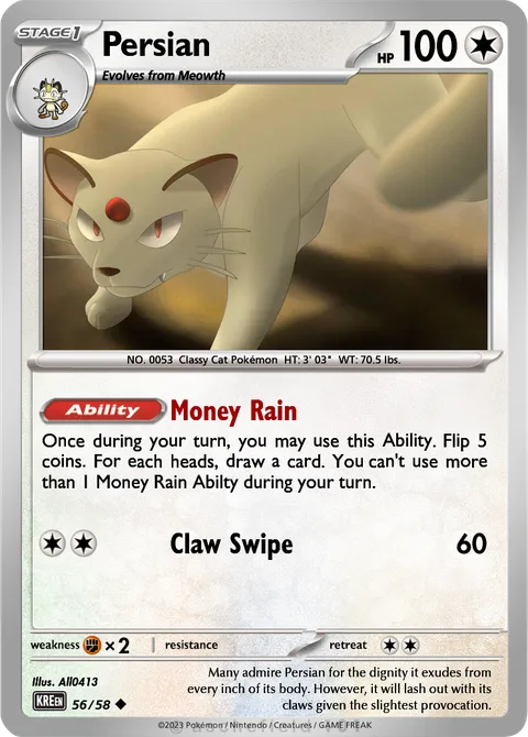 Once during your turn, you may use this Ability. Flip 5 coins. For each heads, draw a card. You can't use more than 1 Money Rain Abilty during your turn.Claw Swipe • 60